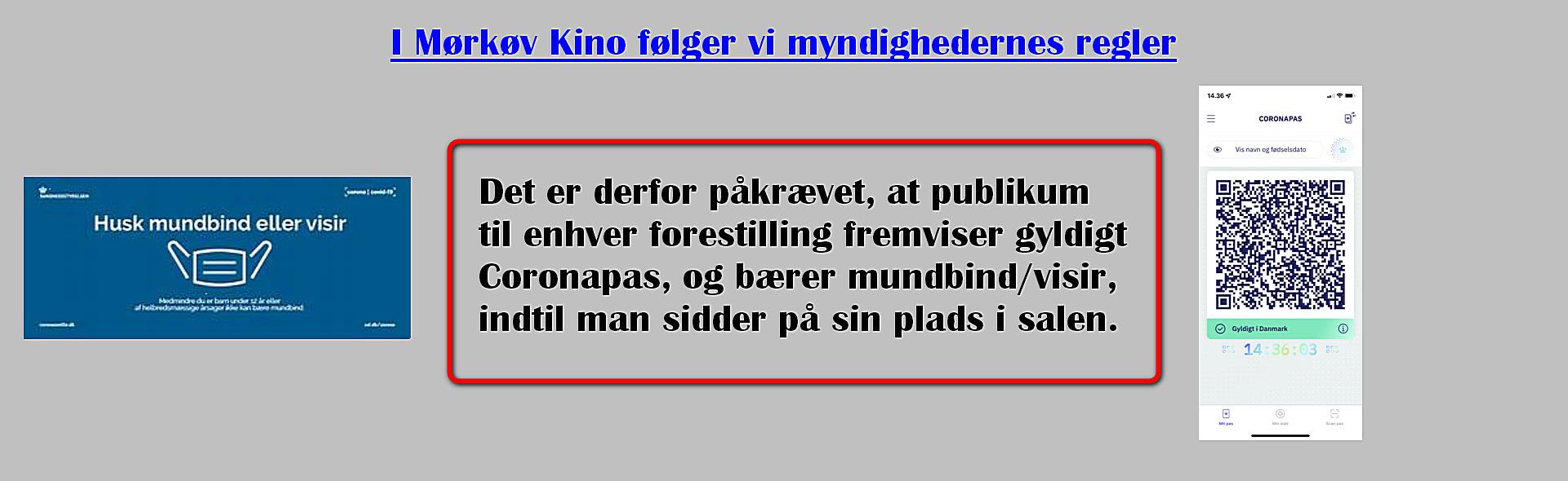 Når du besøger Mørkøv Kino skal du fremvise gyldigt coronapas. Et gyldigt coronapas dokumenterer en af følgende: